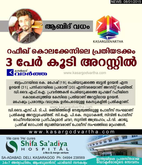 Keywords : Kasaragod, Murder, Case, Accuse, Arrest, Police, Investigation, Zainul AbiD, Abid Murder case: 3 arrested.