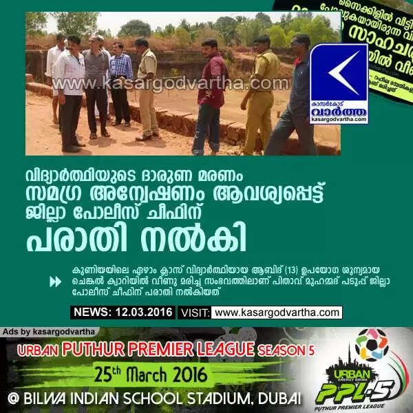 പെരിയ: (www.kasargodvartha.com 12/03/2016) കുണിയയിലെ ഏഴാം ക്ലാസ് വിദ്യാര്ത്ഥിയായ ആബിദ് (13) ഉപയോഗ ശൂന്യമായ ചെങ്കല് ക്വാറിയില് വീണു മരിച്ച സംഭവത്തില് സമഗ്രാന്വേഷണം നടത്തി അപകടത്തിനു പിന്നിലെ ദുരൂഹത പുറത്തു കൊണ്ടുവരണമെന്നാവശ്യപ്പെട്ട് പിതാവ് മുഹമ്മദ് പടുപ്പ് ജില്ലാ പോലീസ് ചീഫിന് പരാതി നല്കി. ഇക്കഴിഞ്ഞ വ്യാഴാഴ്ച വൈകുന്നേരം 3.30 ഓടെയാണ് കുണിയ ഗവ ഹയര് സെക്കന്ഡറി സ്കൂളിലെ വിദ്യാര്ത്ഥിയായ ആബിദ് തോക്കാനം മൊട്ട അടുക്കം പ്രദേശത്തെ ചെങ്കല് ക്വാറിയില് ദുരൂഹ സാഹചര്യത്തില് അപകടത്തില് പെട്ടത്.