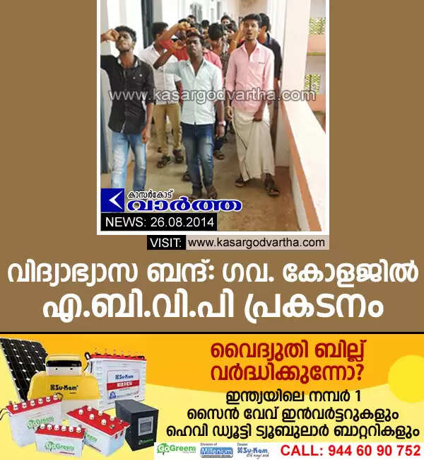 കാസര്‍കോട്: (www.kasargodvartha.com 26.08.2014) എ.ബി.വി.പി ചൊവ്വാഴ്ച സംസ്ഥാന വ്യാപകമായി നടത്തുന്ന വിദ്യാഭ്യാസ ബന്ദിന്റെ ഭാഗമായി കാസര്‍കോട് ഗവ. കോളജില്‍ പ്രവര്‍ത്തകര്‍ പടിപ്പു മുടക്കി. എ.ബി.വി.പി യൂണിറ്റ് പ്രസിഡണ്ട് അവിന്റെ നേതൃത്വത്തില്‍ ക്യാമ്പസില്‍ പ്രകടനവും നടത്തി.