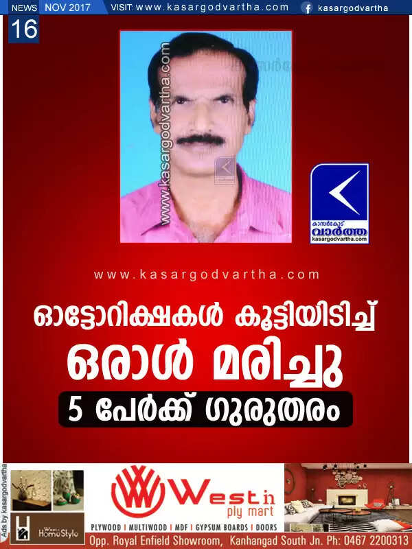 Keywords:  Kerala, kasaragod, Accident, news, Death, Injured, Auto Driver, Mavungal, Kanhangad, Accident: 1 died and 5 injured