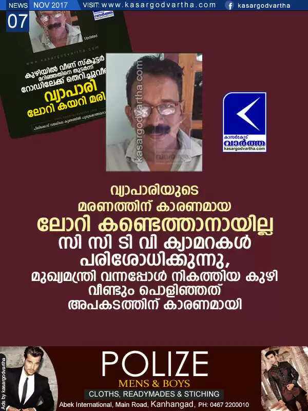 വ്യാപാരിയുടെ മരണത്തിന് കാരണമായ ലോറി കണ്ടെത്താനായില്ല; സി സി ടി വി ക്യാമറകള് പരിശോധിക്കുന്നു, മുഖ്യമന്ത്രി വന്നപ്പോള് നികത്തിയ കുഴി വീണ്ടും പൊളിഞ്ഞത് അപകടത്തിന് കാരണമായി