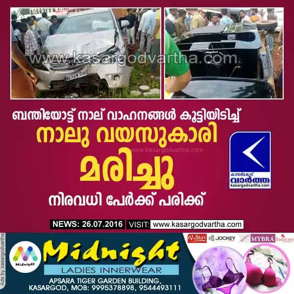 ബന്തിയോട്ട് നാല് വാഹനങ്ങള് കൂട്ടിയിടിച്ച് നാലു വയസുകാരി മരിച്ചു; നിരവധി പേര്ക്ക് പരിക്ക്