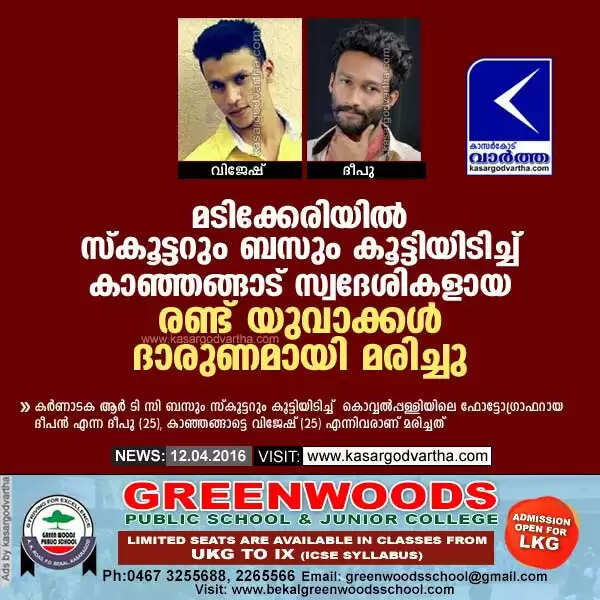 കാഞ്ഞങ്ങാട്: (www.kasargodvartha.com 12.04.2016) മടിക്കേരിയില്‍ സ്‌കൂട്ടറും ബസും കൂട്ടിയിടിച്ച് കാഞ്ഞങ്ങാട് സ്വദേശികളായ രണ്ട് യുവാക്കള്‍ ദാരുണമായി മരിച്ചു. മൈസൂര്‍ - ഹുന്‍സൂര്‍ ദേശീയപാതയില്‍ കുശാല്‍നഗറിന് സമീപം പെരിയ പട്ടണത്തിലാണ് അപകടം. കര്‍ണാടക ആര്‍ ടി സി ബസും സ്‌കൂട്ടറും കൂട്ടിയിടിച്ച്  കൊവ്വല്‍പ്പള്ളിയിലെ ഐ പ്ലസ് സ്റ്റുഡിയോ ഉടമയും കാഞ്ഞങ്ങാട് സൗത്ത് സ്വദേശിയുമായ ദിനേശന്‍ - നെല്ലിക്കാട്ടെ കെ ടി ബിന്ദു ദമ്പതികളുടെ  മകനും ഫോട്ടോഗ്രാഫറുമായ ദീപന്‍ എന്ന ദീപു (25), കാഞ്ഞങ്ങാട്ടെ ടാക്‌സി ഡ്രൈവര്‍ നെല്ലിക്കാട്ടെ ഗംഗാധര നായക് -  ജയ ദമ്പതികളുടെ മകന്‍ വിജേഷ് (25) എന്നിവരാണ് മരിച്ചത്.