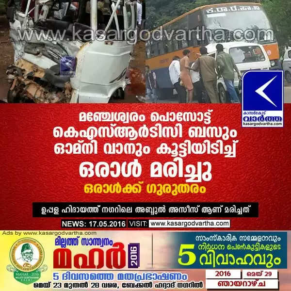 മഞ്ചേശ്വരം പൊസോട്ട് കര്ണ്ണാടക കെഎസ്ആര്ടിസി ബസും ഓമ്നിവാനും കൂട്ടിയിടിച്ച് ഒരാള് മരിച്ചു; ഒരാള്ക്ക് ഗുരുതരം