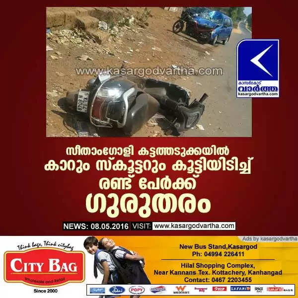 സീതാംഗോളി: (www.kasargodvartha.com 08.05.2016) കട്ടത്തടുക്കയില് കാറും സ്കൂട്ടറും കൂട്ടിയിടിച്ച് അഞ്ച് പേര്ക്ക് പരിക്കേറ്റു. ഇതില് ഗുരുതരമായി പരിക്കേറ്റ രണ്ട് പേരെ മംഗളൂരുവിലെ ആശുപത്രിയില് പ്രവേശിപ്പിച്ചു.