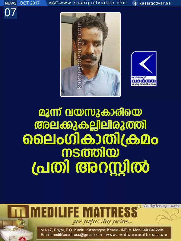 കാസര്കോട്: (www.kasargodvartha.com 07/10/2017) മൂന്ന് വയസുകാരിയെ അലക്കുകല്ലിലിരുത്തി ലൈംഗികാതിക്രമം നടത്തിയ പ്രതി അറസ്റ്റില്. കാസര്കോട് ബെദ്രടുക്കയിലെ കെ സുകുമാര(36)നെയാണ് കാസര്കോട് സി ഐ അബ്ദുര് റഹീമും സംഘവും അറസ്റ്റ് ചെയ്തത്.