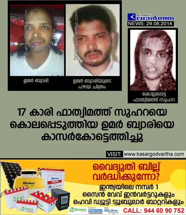 17 കാരി ഫാത്വിമത്ത് സുഹറയെ കൊലപ്പെടുത്തിയ ഉമര്‍ ബ്യാരിയെ കാസര്‍കോട്ടെത്തിച്ചു