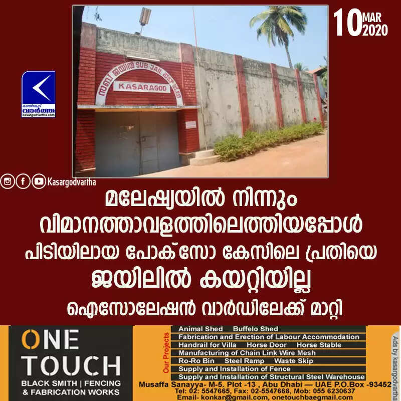 മലേഷ്യയില് നിന്നും വിമാനത്താവളത്തിലെത്തിയപ്പോള് പിടിയിലായ പോക്സോ കേസിലെ പ്രതിയെ ജയിലില് കയറ്റിയില്ല; ഐസോലേഷന് വാര്ഡിലേക്ക് മാറ്റി