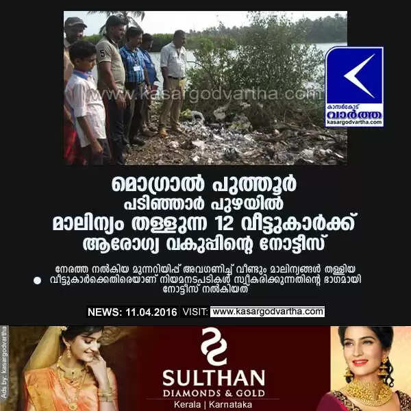 മൊഗ്രാല് പുത്തൂര് പടിഞ്ഞാര് പുഴയില് മാലിന്യം തള്ളുന്ന 12 വീട്ടുകാര്ക്ക് ആരോഗ്യ വകുപ്പിന്റെ നോട്ടീസ്