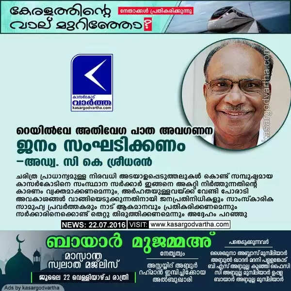 റെയില്വേ അതിവേഗ പാത അവഗണന; ജനം സംഘടിക്കണം: അഡ്വ.സി കെ ശ്രീധരന്