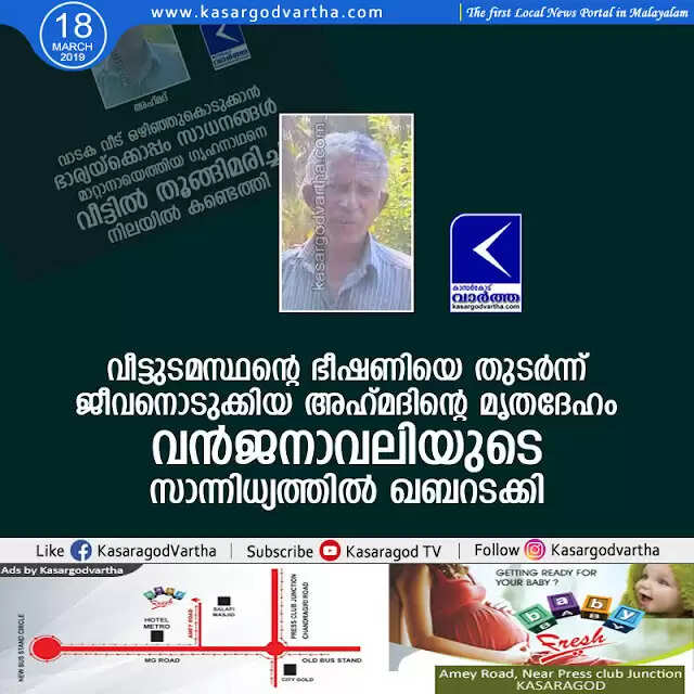 ഞായറാഴ്ച വൈകുന്നേരമാണ് എരിയാല് കുളങ്കര സ്വദേശിയും ചൗക്കി ബദര് മസ്ജിദിന് സമീപം വാടകവീട്ടില് താമസക്കാരനുമായ അഹ് മദിനെ (55) തൂങ്ങിമരിച്ചനിലയില് കണ്ടെത്തിയത്. വാടകവീട് ഒഴിഞ്ഞുകൊടുക്കാനാവശ്യപ്പെട്ട് ഉടമസ്ഥന് നിരന്തരം ഭീഷണിപ്പെടുത്തിയിരുന്നു. അടുത്ത മാസം മകളുടെ വിവാഹം നടക്കാനിരിക്കുന്ന സാഹചര്യത്തില് വീടിറങ്ങുന്നത് പ്രയാസമാണെന്നും വിവാഹം കഴിയും വരെയെങ്കിലും സാവകാശം നല്കണമെന്നും അഹമദ് കെഞ്ചിപ്പറഞ്ഞിരുന്നെങ്കിലും വീട്ടുടമസ്ഥന് കൂട്ടാക്കിയിരുന്നില്ല.