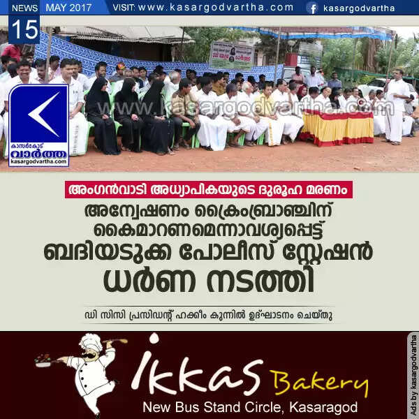 അംഗന്വാടി അധ്യാപികയുടെ ദുരൂഹ മരണം: അന്വേഷണം ക്രൈംബ്രാഞ്ചിന് കൈമാറണമെന്നാവശ്യപ്പെട്ട് ബദിയടുക്ക പോലീസ് സ്റ്റേഷന് ധര്ണ നടത്തി