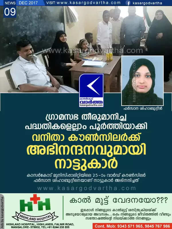 കാസര്കോട്: (www.kasargodvartha.com 09.12.2017) ഗ്രാമസഭ തീരുമാനിച്ച പദ്ധതികളെല്ലാം പൂര്ത്തിയാക്കിയ വനിതാ കൗണ്സിലര്ക്ക് അഭിനന്ദനവുമായി നാട്ടുകാര്. കാസര്കോട് മുനിസിപ്പാലിറ്റിയിലെ 25-ാം വാര്ഡ് ഗ്രാമസഭാ യോഗം അംഗീകരിച്ച പദ്ധതികളാണ് കൗണ്സിലര് മുഴുവനും പൂര്ത്തിയാക്കിയത്. കഴിഞ്ഞ ഗ്രാമസഭാ യോഗങ്ങളില് എടുത്ത തീരുമാനങ്ങളില് ബഹുഭൂരിഭാഗവും നടപ്പിലാക്കുകയും മിച്ചമുള്ള പദ്ധതിക്ക് അനുമതി ഏറ്റെടുക്കുകയും ചെയ്ത കൗണ്സിലര് ഫര്സാന ശിഹാബുദ്ദീനെ കഴിഞ്ഞ ദിവസം ചേര്ന്ന ഗ്രാമസഭാ യോഗം അഭിനന്ദിച്ചു.