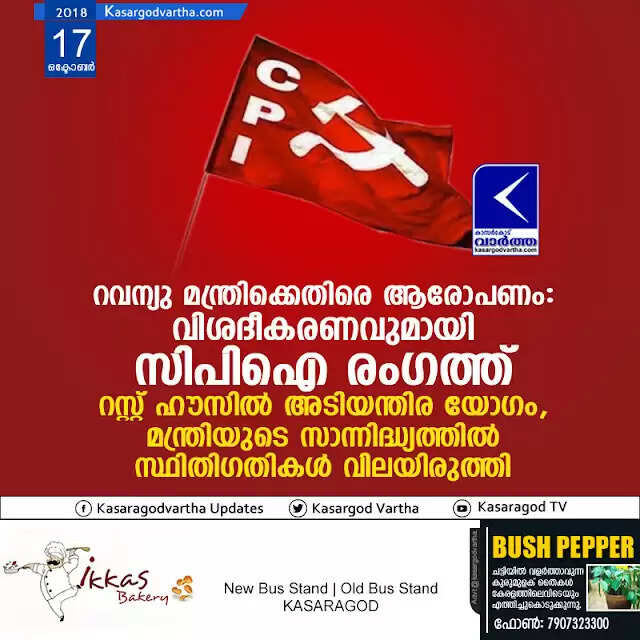റവന്യു മന്ത്രിക്കെതിരെ ആരോപണം: വിശദീകരണവുമായി സിപിഐ രംഗത്ത്; റസ്റ്റ് ഹൗസില് അടിയന്തിര യോഗം, മന്ത്രിയുടെ സാന്നിദ്ധ്യത്തില് സ്ഥിതിഗതികള് വിലയിരുത്തി