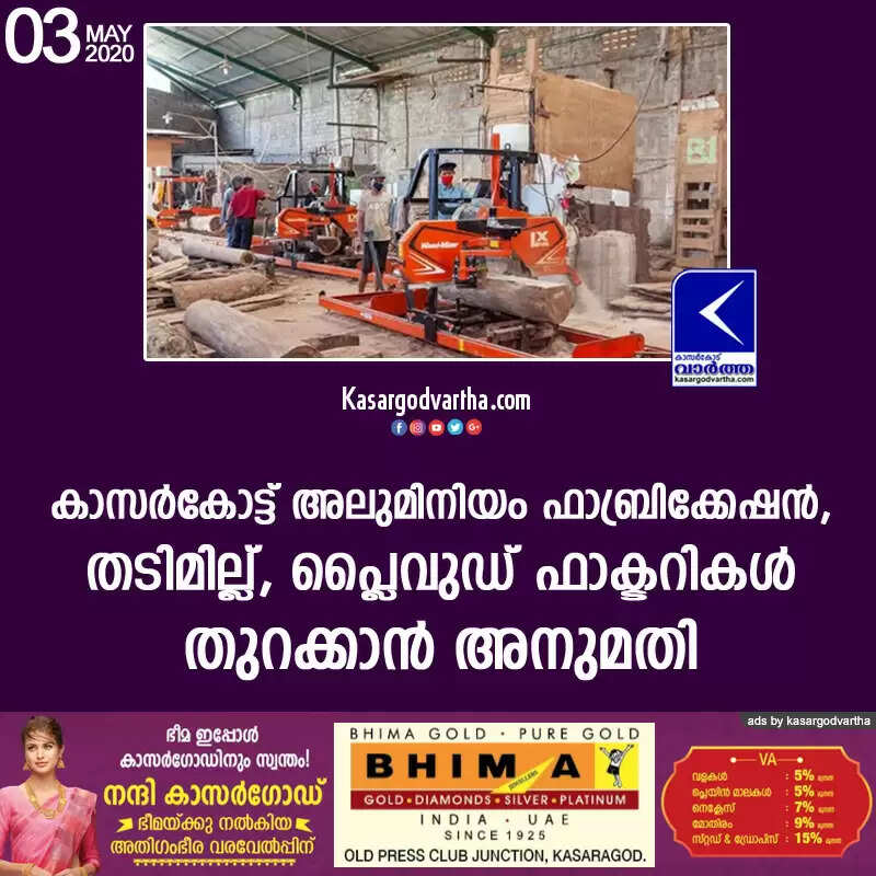 കാസര്കോട്ട് അലുമിനിയം ഫാബ്രിക്കേഷന്, തടിമില്ല്, പ്ലൈവുഡ് ഫാക്ടറികള് തുറക്കാന് അനുമതി