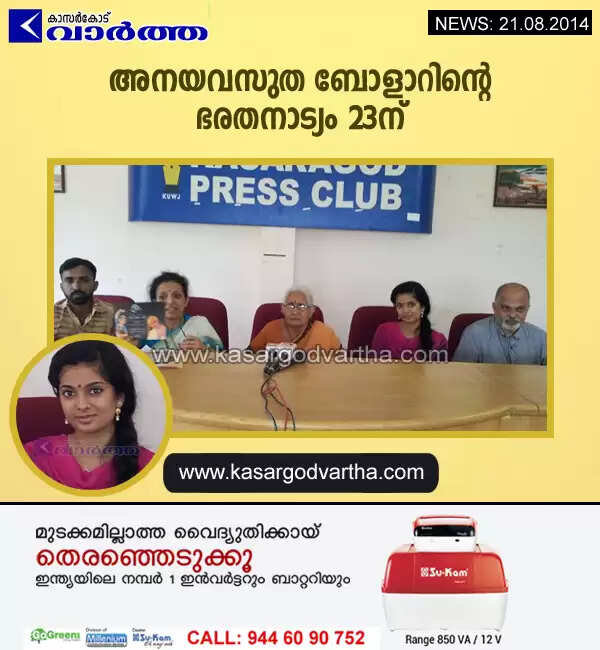 കാസര്കോട്: (www.kasargodvartha.com 21.08.2014) പ്രസിദ്ധ ഭരതനാട്യ കലാകാരിയും ബ്രിട്ടനിലെ നിരവധി അവാര്ഡ് ജേതാവുമായ അനയവസുത ബോളാറിന്റെ ഭരതനാട്യം 23ന് വൈകിട്ട് ആറ് മണിക്ക് ബീരന്ത്വയല് ലളിതകലാസദനത്തില് നടക്കും.