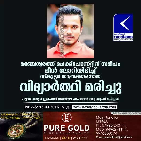 മഞ്ചേശ്വരം ചെക്ക്‌പോസ്റ്റിന് സമീപം മീന്‍ ലോറിയിടിച്ച് സ്‌കൂട്ടര്‍ യാത്രക്കാരനായ വിദ്യാര്‍ത്ഥി മരിച്ചു