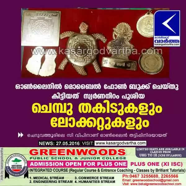 ചെറുവത്തൂര്: (www.kasargodvartha.com 27.05.2016) ഓണ്ലൈനിലൂടെ ബുക്ക് ചെയ്ത മൊബൈല് ഫോണിനു പകരം കിട്ടിയത് സ്വര്ണനിറം പൂശിയ ചെമ്പുതകിടുകളും ലോക്കറ്റുകളും. ചെറുവത്തൂരിലെ സി വിപിനാണ് ഓണ്ലൈന് തട്ടിപ്പിനിരയായത്.