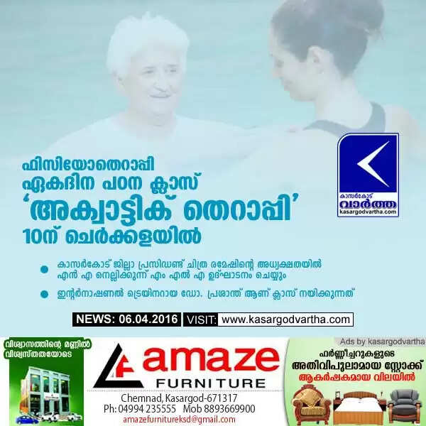 ഫിസിയോതെറാപ്പി ഏകദിന പഠന ക്ലാസ് 'അക്വാട്ടിക് തെറാപ്പി' 10ന് ചെര്ക്കളയില്