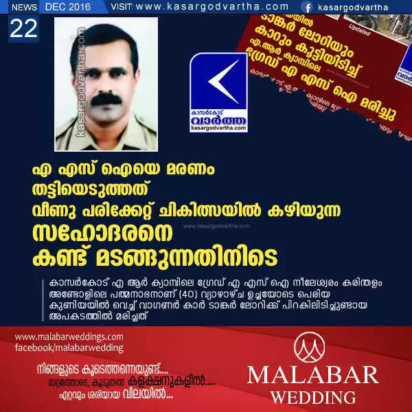 പെരിയ: (www.kasargodvartha.com 22/12/2016) കാസര്കോട് എ ആര് ക്യാമ്പിലെ ഗ്രേഡ് എ എസ് ഐ നീലേശ്വരം കരിന്തളം അണ്ടോളിലെ പത്മനാഭനെ (40) മരണം തട്ടിയെടുത്തത് വീണു പരിക്കേറ്റ് ചികിത്സയില് കഴിയുന്ന സഹോദരനെ കണ്ട് മടങ്ങുന്നതിനിടെ. വ്യാഴാഴ്ച ഉച്ചയോടെയാണ് പെരിയ കുണിയയില് വെച്ച് പത്മനാഭന് സഞ്ചരിച്ച വാഗണര് കാര് ടാങ്കര് ലോറിക്ക് പിറകിലിടിച്ച് അപകടം സംഭവിച്ചത്.
