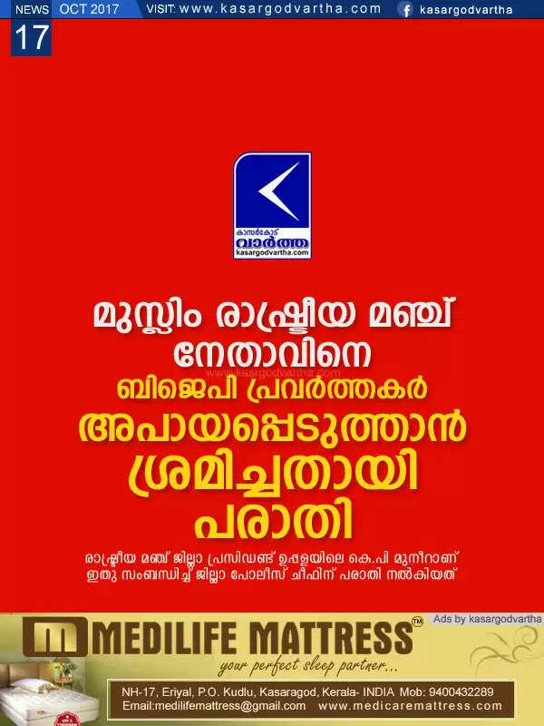 Keywords: Kasaragod, Kerala, news, Uppala, complaint, Leader, Assault attempt; Muslim Rashtriya Manch leader complaint lodged