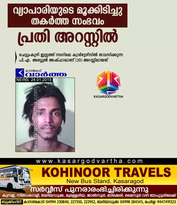 കാസര്കോട്: (www.kasargodvartha.com 24/01/2015) കടയില് കയറി വ്യാപാരിയുടെ മൂക്ക് പഞ്ചു കൊണ്ട് ഇടിച്ചു തകര്ത്ത സംഭവത്തില് നിരവധി അക്രമക്കേസുകളില് പ്രതിയായ യുവാവിനെ പോലീസ് അറസ്റ്റു ചെയ്തു. ചെട്ടുംകുഴി ഇസ്സത്ത് നഗറിലെ ക്വാര്ട്ടേഴ്സില് താമസിക്കുന്ന പി.എ. അബ്ദുല് അഷ്ഫാഖാണ് (20) അറസ്റ്റിലായത്.