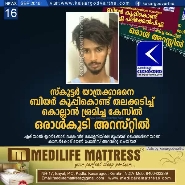 സ്കൂട്ടര് യാത്രക്കാരനെ ബിയര് കുപ്പികൊണ്ട് തലക്കടിച്ച് കൊല്ലാന് ശ്രമിച്ച കേസില് ഒരാള്കൂടി അറസ്റ്റില്
