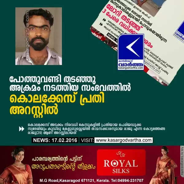 കാസര്കോട്: (www.kasargodvartha.com 17.02.2016) പോത്തുവണ്ടി തടഞ്ഞു അക്രമം നടത്തിയ സംഭവത്തില് കൊലക്കേസ് പ്രതിയായ ഒരാള് കൂടി അറസ്റ്റില്. പോത്തിനെ കൊണ്ടുപോകുന്നതിനിടെ വാഹനം തടഞ്ഞ് യുവാവിനെ അക്രമിച്ച കേസിലാണ് കൊലക്കേസ് അടക്കം നിരവധി കേസുകളില് പ്രതിയായ പെരിയഡുക്ക സ്വദേശിയും കുഡ്ലു കേളുഗുഡ്ഡെയില് താമസക്കാരനുമായ രാജു എന്ന കൊട്ടത്തേങ്ങ രാജു(29) അറസ്റ്റിലായത്. കാസര്കോട് അഡീഷണല് എസ് ഐ കെ സുരേഷിന്റെ നേതൃത്വത്തിലുള്ള പോലീസ് സംഘം ചൊവ്വാഴ്ച രാത്രി ഗുഡ്ഡെ ടെമ്പിളിനടുത്ത് വെച്ച് അറസ്റ്റു ചെയ്തത്.