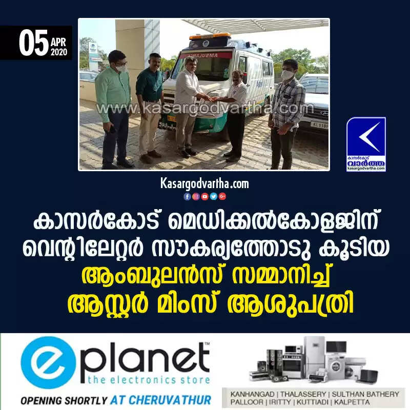 കാസര്കോട് ഗവ. മെഡിക്കല് കോളേജില് തയ്യാറാക്കിയ കോവിഡ് പ്രത്യേക ആശുപത്രിയിലേക്ക് രോഗികളെ എത്തിക്കുന്നതിന് വെന്റിലേറ്റര് മൊബൈല് ഐ സി യു സൗകര്യമുള്ള ആംബുലന്സ് ഇല്ലാത്ത സാഹചര്യത്തില് ആരോഗ്യ വകുപ്പ് മന്ത്രി കണ്ണൂര് ആസ്റ്റര് മിംസ് ആശുപത്രി അധികൃതരോട് സഹായം അഭ്യര്ത്ഥിച്ചിരുന്നു. ഈ അഭ്യര്ത്ഥന മാനിച്ചാണ് കണ്ണൂരും കോഴിക്കോടുമുള്ള ആസ്റ്റര് മിംസ് ആശുപത്രി മാനേജ്മെന്റ് ആംബുലസ് നല്കാന് തീരുമാനിച്ചത്. ആസ്റ്റര് മിംസ് ആശുപത്രി നല്കിയ അത്യാധുനീക സൗകര്യങ്ങളോടെയുള്ള ആംബുലന്സിലാണ് കാസര്കോട് ഗവ. മെഡിക്കല് കോളേജില് കോവിഡ് രോഗികളെ എത്തിക്കുക.