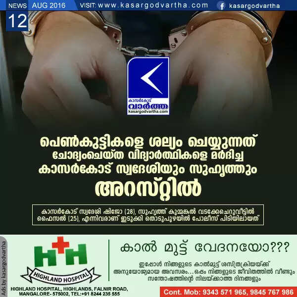 പെണ്കുട്ടികളെ ശല്യം ചെയ്യുന്നത് ചോദ്യംചെയ്ത വിദ്യാര്ത്ഥികളെ മര്ദിച്ച കാസര്കോട് സ്വദേശിയും സുഹൃത്തും അറസ്റ്റില്