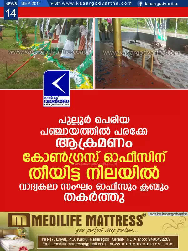 Keywords: Periya, Kasaragod, News, Attack, Congress-office, Fire, Club, Police, Case, Attack against Congress office at Pullur- Periya Panchayath.