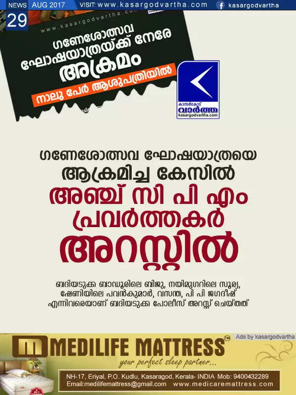 Keywords: Kasaragod, Kerala, news, CPM, Attack, Assault, arrest, Police, attack-against-ganesholsava-yathra; 5 CPM volunteers arrested