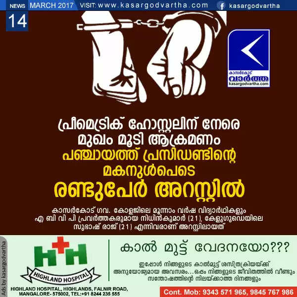 Keywords: Kasaragod, Attack, Arrest, Pemetric Hostel, Students, Clash, Government College, Attack against hostel: 2 arrested