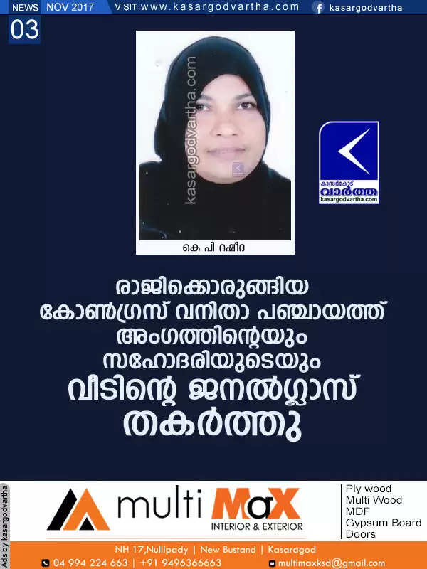 Keywords: News, Kasaragod, Padanna, Congress, House, Complaint, Police, UDF, Muslim league, Rasheeda, Panchayathu member, Attack against Panchayat member's house