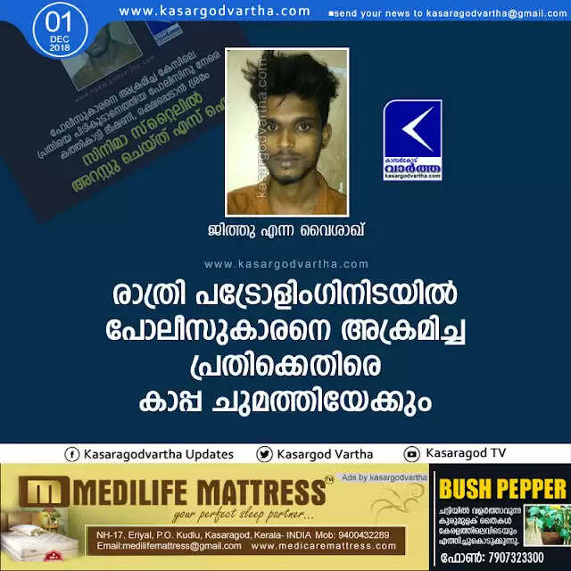കാഞ്ഞങ്ങാട്: (www.kasargodvartha.com 01.12.2018) രാത്രി പട്രോളിംഗിനിടയില് പോലീസുകാരനെ അക്രമിച്ച പ്രതിക്കെതിരെ കാപ്പ ചുമത്തിയേക്കും. സംഭവത്തില് അറസ്റ്റിലായ വെള്ളിക്കോത്തെ ജിത്തു എന്ന വൈശാഖിനെയാണ് ഹൊസ്ദുര്ഗ് ജുഡീഷ്യല് ഒന്നാംക്ലാസ് മജിസ്ട്രേറ്റ് (ഒന്ന്) കോടതി റിമാന്ഡ് ചെയ്തു. വ്യാഴാഴ്ച രാത്രിയാണ് ഹൊസ്ദുര്ഗ് എസ് ഐ വിഷ്ണുപ്രസാദും സംഘവും ജിത്തുവിനെ വീട്ടില് നിന്നും അറസ്റ്റുചെയ്തത്.