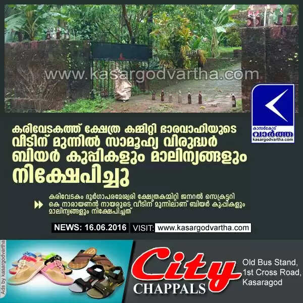 കരിവേടകത്ത് ക്ഷേത്ര കമ്മിറ്റി ഭാരവാഹിയുടെ വീടിന് മുന്നില് സാമൂഹ്യ വിരുദ്ധര് ബിയര് കുപ്പികളും മാലിന്യങ്ങളും നിക്ഷേപിച്ചു