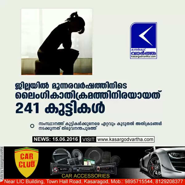കാഞ്ഞങ്ങാട്: (www.kasargodvartha.com 15/06/2016) ജില്ലയില് കഴിഞ്ഞ മൂന്നരവര്ഷത്തിനിടെ ലൈംഗികാതിക്രമത്തിനിരയായത് 241 കുട്ടികള്. ജില്ല തിരിച്ചുള്ള കണക്കനുസരിച്ച് കുട്ടികള്ക്കുനേരെ ഏറ്റവും കൂടുതല് അതിക്രമങ്ങള് നടക്കുന്നത് തിരുവനന്തപുരത്താണ്.