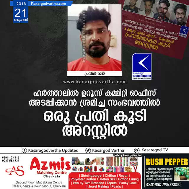 കുമ്പള: (www.kasargodvartha.com 21.10.2018) ശബരിമല സ്ത്രീ പ്രവേശനവുമായി ബന്ധപ്പെട്ട് ശബരിമല സംരക്ഷണ സമിതിയുടെ ആഭിമുഖ്യത്തില് കഴിഞ്ഞ ദിവസം നടന്ന ഹര്ത്താലിനിടെ കുമ്പളയില് ഉറൂസ് കമ്മിറ്റി ഓഫീസ് അടപ്പിക്കാന് ശ്രമിച്ച സംഭവത്തില് ഒരു പ്രതിയെ കൂടി പോലീസ് അറസ്റ്റു ചെയ്തു. കൊളത്തൂര് ചെക്ക്പോസ്റ്റിനു സമീപത്തെ പ്രവീണ് രാജിനെ (43) കുമ്പള പോലീസ് അറസ്റ്റു ചെയ്തത്.