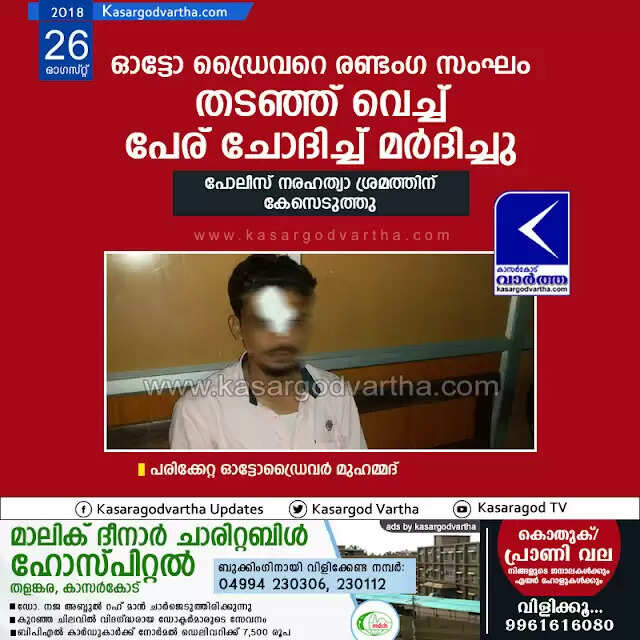 കാസര്‍കോട്: (www.kasargodvartha.com 26.08.2018) ഓട്ടോ ഡ്രൈവറെ രണ്ടംഗ സംഘം പേര് ചോദിച്ച് മര്‍ദിച്ച സംഭവത്തില്‍ പോലീസ് നരഹത്യ ശ്രമത്തിന് കേസെടുത്തു.  ഉളിയത്തടുക്ക ഇസ്സത്ത് നഗറിലെ മുഹമ്മദിനെ (40)യാണ് മുക്കിനിടിച്ച് പരിക്കേല്‍പ്പിച്ചത്. സംഘത്തിലെ ഒരാള്‍ മുഖം മറച്ചിരുന്നതായും ഓട്ടോ ഡ്രൈവര്‍ പറയുന്നു. 308, 153 വകുപ്പുകള്‍ പ്രകാരമാണ് കണ്ടാലറിയാവുന്ന രണ്ട് പേര്‍ക്കെതിരെ ടൗണ്‍ പോലീസ് കേസെടുത്തത്.