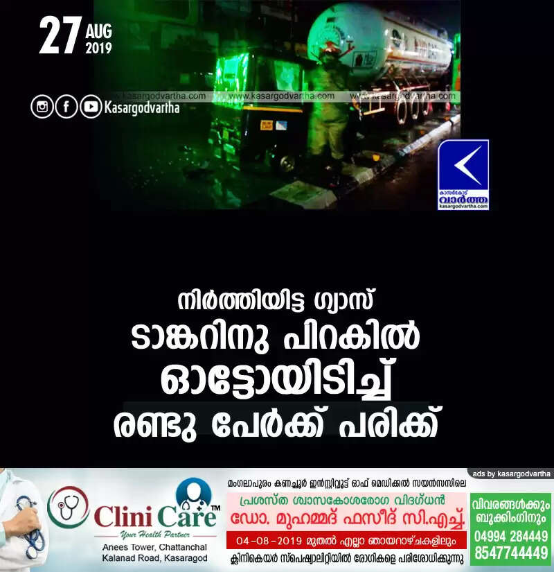 Keywords: Kasaragod, Kerala, news, Kanhangad, Injured, Auto-rickshaw, Auto rikshaw hit in Gas Tanker; 2 injured