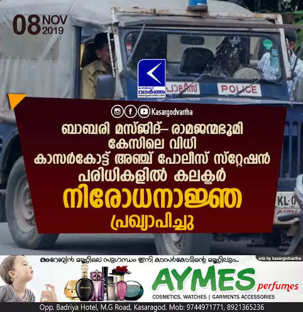 ബാബരി മസ്ജിദ്-രാമജന്മഭൂമി കേസിലെ വിധി: കാസര്കോട്ട് അഞ്ച് പോലീസ് സ്റ്റേഷന് പരിധികളില് കലക്ടര് നിരോധനാജ്ഞ പ്രഖ്യാപിച്ചു
