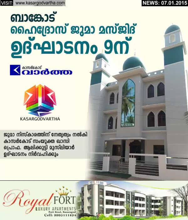 കാസര്‍കോട്: (www.kasargodvartha.com 07/01/2015) തളങ്കര ബാങ്കോട് ഹൈദ്രോസ് ജുമാ മസ്ജിദിന്റെ ഉദ്ഘാടനം വെള്ളിയാഴ്ച നടക്കും. ജുമാ നിസ്‌കാരത്തിന് നേതൃത്വം നല്‍കി കാസര്‍കോട് സംയുക്ത ഖാസി പ്രൊഫ. ആലിക്കുട്ടി മുസ്‌ലിയാര്‍ ഉദ്ഘാടനം നിര്‍വഹിക്കും.