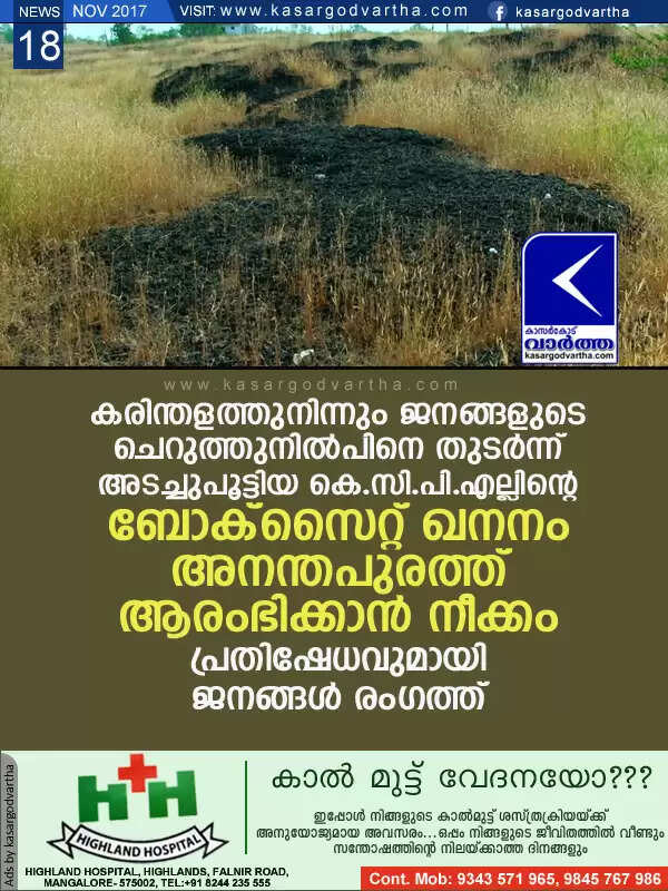 കരിന്തളത്തുനിന്നും ജനങ്ങളുടെ ചെറുത്തുനില്പിനെ തുടര്ന്ന് അടച്ചുപൂട്ടിയ കെ.സി.പി.എല്ലിന്റെ ബോക്സൈറ്റ് ഖനനം അനന്തപുരത്ത് ആരംഭിക്കാന് നീക്കം; പ്രതിഷേധവുമായി ജനങ്ങള് രംഗത്ത്