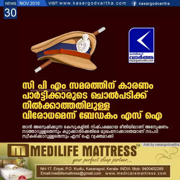 ബേഡകം: (www.kasargodvartha.com 30.11.2016) തനിക്കെതിരെ സമരം നടത്താന്‍ സി പി എം നേതൃത്വത്തെ പ്രേരിപ്പിച്ചത് പാര്‍ട്ടിക്കാരുടെ ചൊല്‍പടിക്ക് നില്‍ക്കാത്തതിലുള്ള വിരോധമാണെന്ന് ബേഡകം എസ് ഐ ടി കെ മുകുന്ദന്‍ കാസര്‍കോട് വാര്‍ത്തയോട് പറഞ്ഞു. താന്‍ അന്വേഷിക്കുന്ന കേസുകളില്‍ നിഷ്പക്ഷമായ രീതിയിലാണ് അന്വേഷണം നടത്താറുള്ളതെന്നും കുറ്റക്കാര്‍ക്കെതിരെ മുഖംനോക്കാതെയാണ് നടപടി സ്വീകരിക്കാറുള്ളതെന്നും എസ് ഐ വ്യക്തമാക്കി.