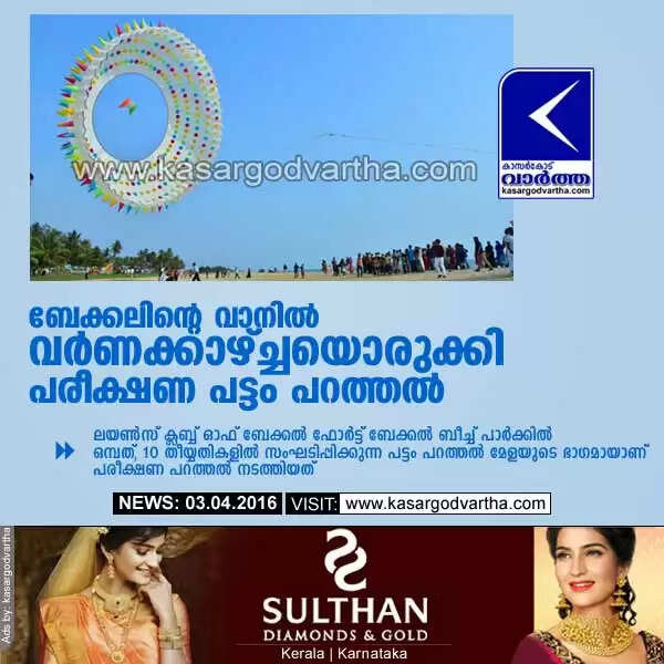 ബേക്കല്: (www.kasargodvartha.com 03.04.2016) ലയണ്സ് ക്ലബ്ബ് ഓഫ് ബേക്കല് ഫോര്ട്ട് ബേക്കല് ബീച്ച് പാര്ക്കില് ഏപ്രില് ഒമ്പത്, 10 തീയ്യതികളില് സംഘടിപ്പിക്കുന്ന പട്ടം പറത്തല് മേളയുടെ ഭാഗമായുള്ള പരീക്ഷണ പറത്തല് ശ്രദ്ധേയമായി. അത്യുഷ്ണത്തില് ആശ്വാസം തേടി പാര്ക്കിലും കടല് തീരത്തും എത്തിയ ആയിരങ്ങളില് ആഹ്ലാദവും ആനന്ദവും വര്ണ കാഴ്ചയും ഒരുക്കിയ പട്ടം പറത്തല് നവ്യാനുഭവമായി.
