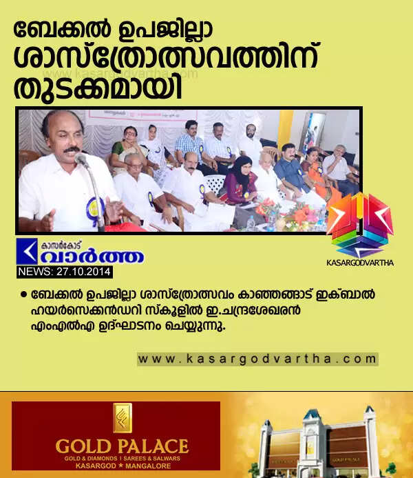(www.kasargodvartha.com 27.10.2014) ബേക്കല്‍ ഉപജില്ലാ ശാസ്‌ത്രോത്സവം കാഞ്ഞങ്ങാട് ഇക്ബാല്‍ ഹയര്‍സെക്കന്‍ഡറി സ്‌കൂളില്‍ ഇ.ചന്ദ്രശേഖരന്‍ എംഎല്‍എ ഉദ്ഘാടനം ചെയ്യുന്നു. മടിക്കൈ കമാരന്‍, എ. ഹമീദ് ഹാജി, അജാനൂര്‍ പഞ്ചായത്ത് പ്രസിഡണ്ട് നസീമ ടീച്ചര്‍, മെട്രോ മുഹമ്മദ് ഹാജി, എം.ബി അഷ്‌റഫ് തുടങ്ങിയവര്‍ സമീപം.