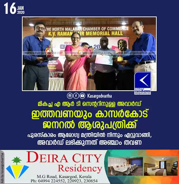 SUMMARY: The ART centre attached to General Hospital Kasaragod has recieved "Best ART centre" award of 2019. The Senior Medical officer Dr. Janardhana Naik CH recieved award from Hon'ble health Minister smt. Shylaja Teacher in a program held at North Malabar chamber of commerce hall Kannur on 13.1.20