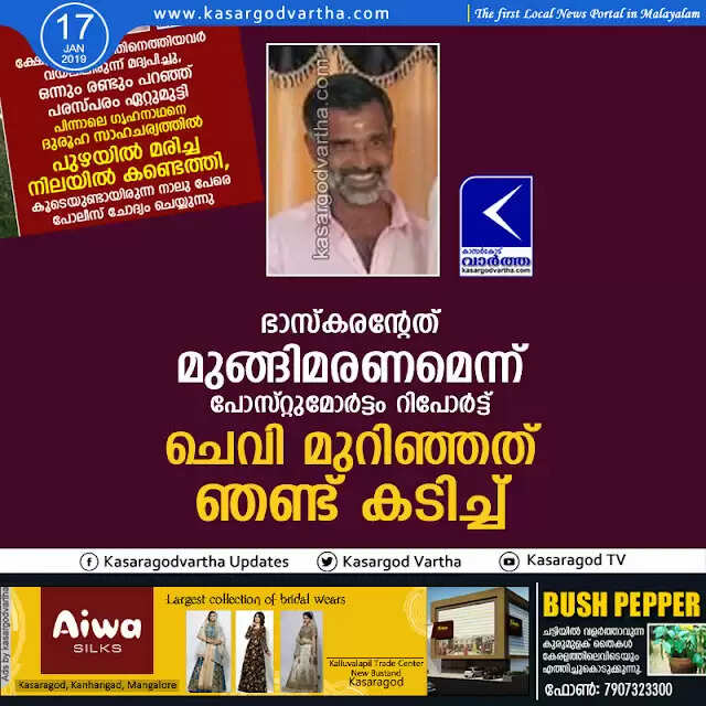 Keywords:  Bhaskaran's death; Postmortem report revealed, Vellarikundu, Kasaragod, News, Death, Postmortem, Report, Medical College, Hospital, Police, Enquiry, Temple fest, Drinkers, Kerala.