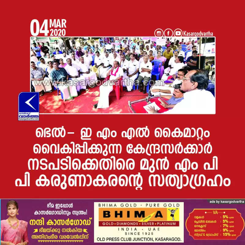ഭെല്- ഇ എം എല് കൈമാറ്റം വൈകിപ്പിക്കുന്ന കേന്ദ്രസര്ക്കാര് നടപടിക്കെതിരെ മുന് എം പി പി കരുണാകരന്റെ സത്യാഗ്രഹം