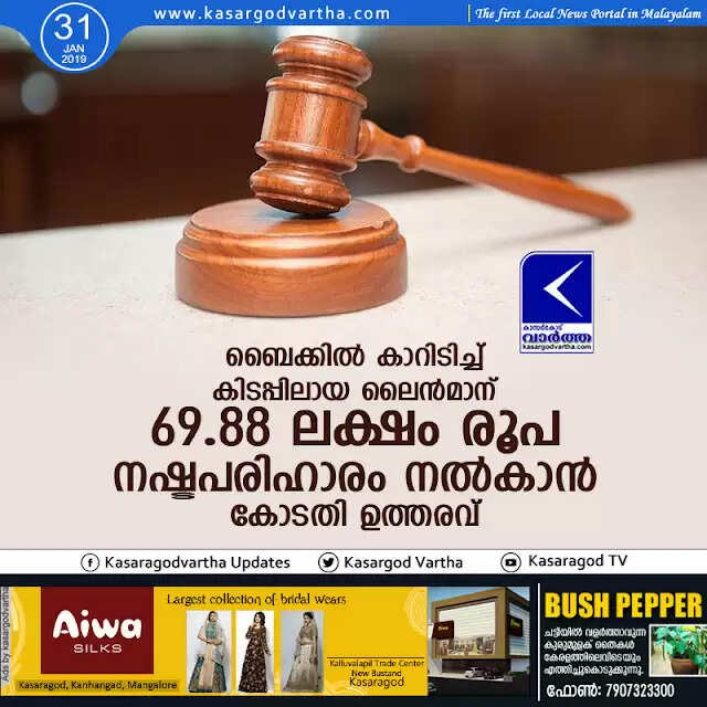കാസര്‍കോട്: (www.kasargodvartha.com 31.01.2019) ബൈക്കില്‍ കാറിടിച്ച് കിടപ്പിലായ ലൈന്‍മാന് 69.88 ലക്ഷം രൂപ നഷ്ടപരിഹാരം നല്‍കാന്‍ കോടതി ഉത്തരവിട്ടു. തൃക്കരിപ്പൂര്‍ എടാട്ടുമ്മലിലെ കെ എസ് ഇ ബി ലൈന്‍മാന് ടി സുരേഷിനാണ് (46) കാസര്‍കോട് പ്രിന്‍സിപ്പല്‍ മോട്ടോര്‍ ആക്‌സിഡണ്ട് ട്രിബ്യൂണല്‍ നഷ്ടപരിഹാരം നല്‍കാന്‍ വിധിച്ചത്. 2016 നവംബര്‍ 27ന് കൊയോങ്കര വെറ്റിനറി ആശുപത്രിക്ക് സമീപത്തുണ്ടായ അപകടത്തിലാണ് സുരേഷിന് ഗുരുതരമായി പരിക്കേറ്റത്.